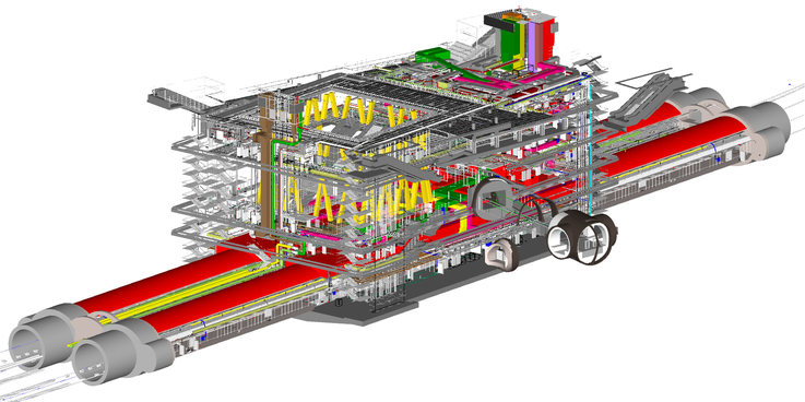 Axonometry of the diaphragm wall box constructed using the cut-and-cover method and the four tunnels for the platform levels. In front: the pedestrian tunnel to the existing subway. All tunnels are being built using the mining method.