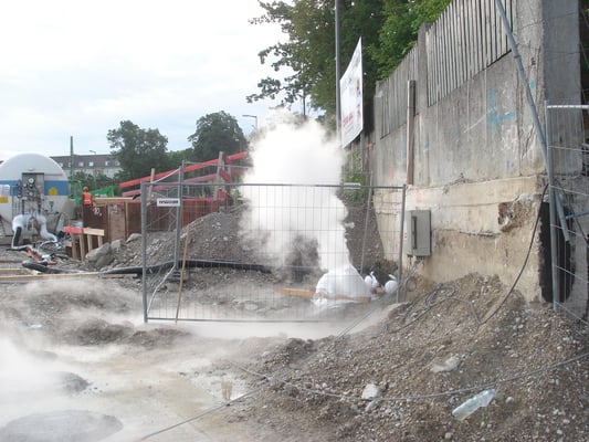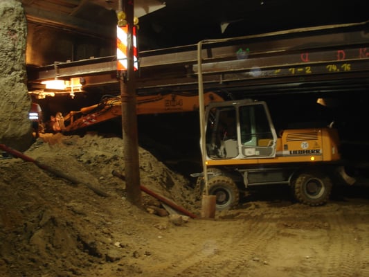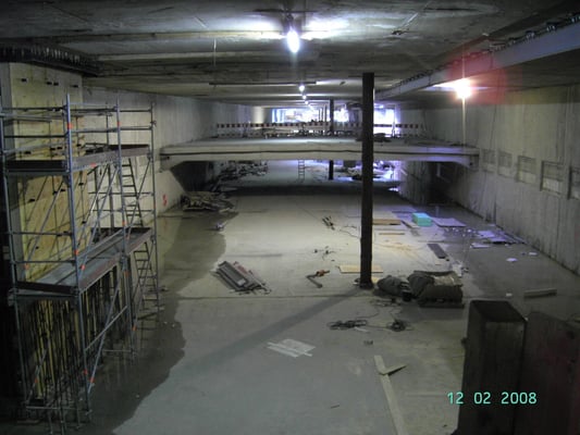 Upfront a sewer was deviated out of the area of the underground car park by means of 86m of pipe jacking (DIN 1200) under the Station of German Rail.