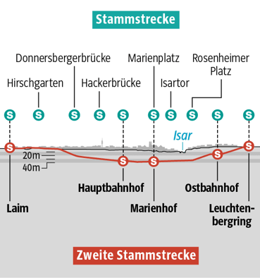 To relieve passenger traffic of the existing main line, a second approximately 11 kilometres long main line is being built between Laim station in the west and Leuchtenbergring station in the east. The centrepiece is a seven kilometre long tunnel connecting the newly to-be-built underground stations Hauptbahnhof and Ostbahnhof, with the underground station Marienhof located in between.