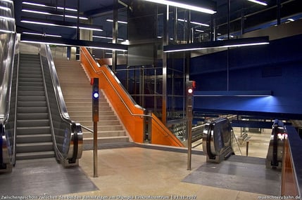 Crossing station of German Rail with subway line U3 including a subterranean two story car park and storage sidings